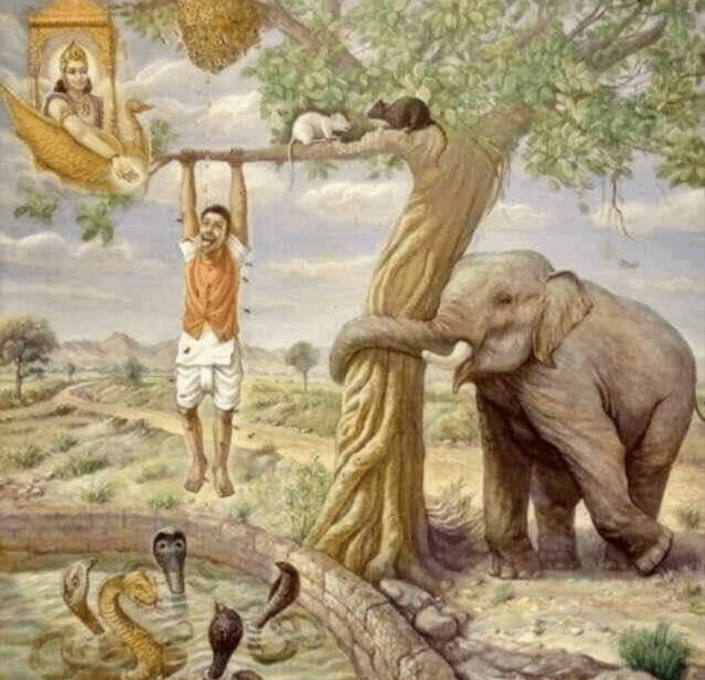 The plight of man in the material world: Once a man was chased by an elephant in a forest. Seeing no respite, he climbed a tree but he slipped, was about to fall before he could hold on to a branch. He looked up and found that the elephant is waiting to devour him and two rats, one black and one white, were slowly nibbling the branch he was hanging on to. He understood that very soon the branch would fall to the ground.